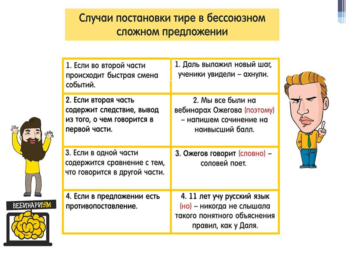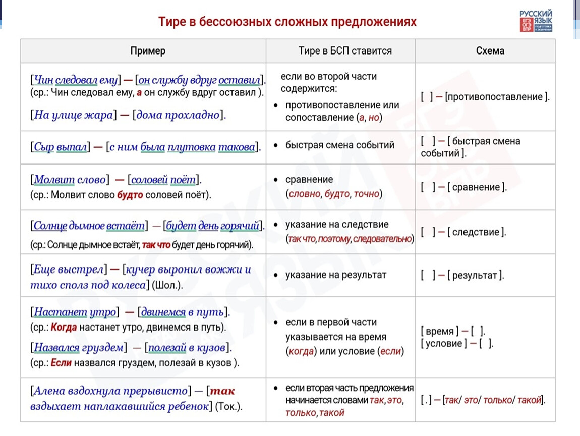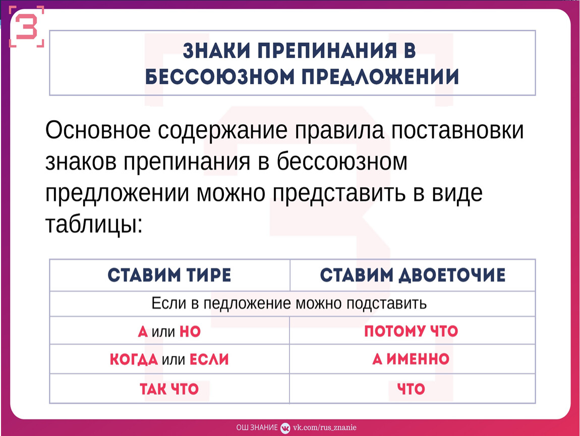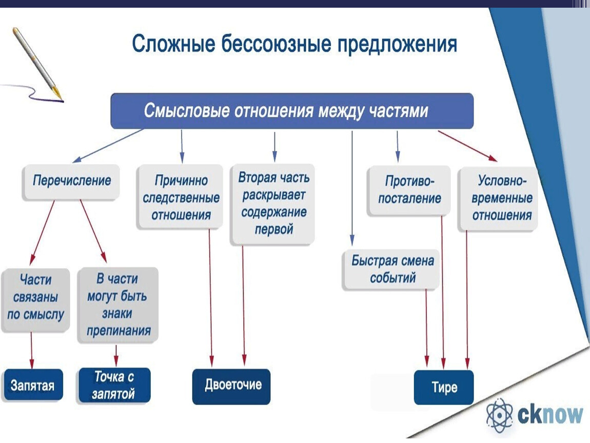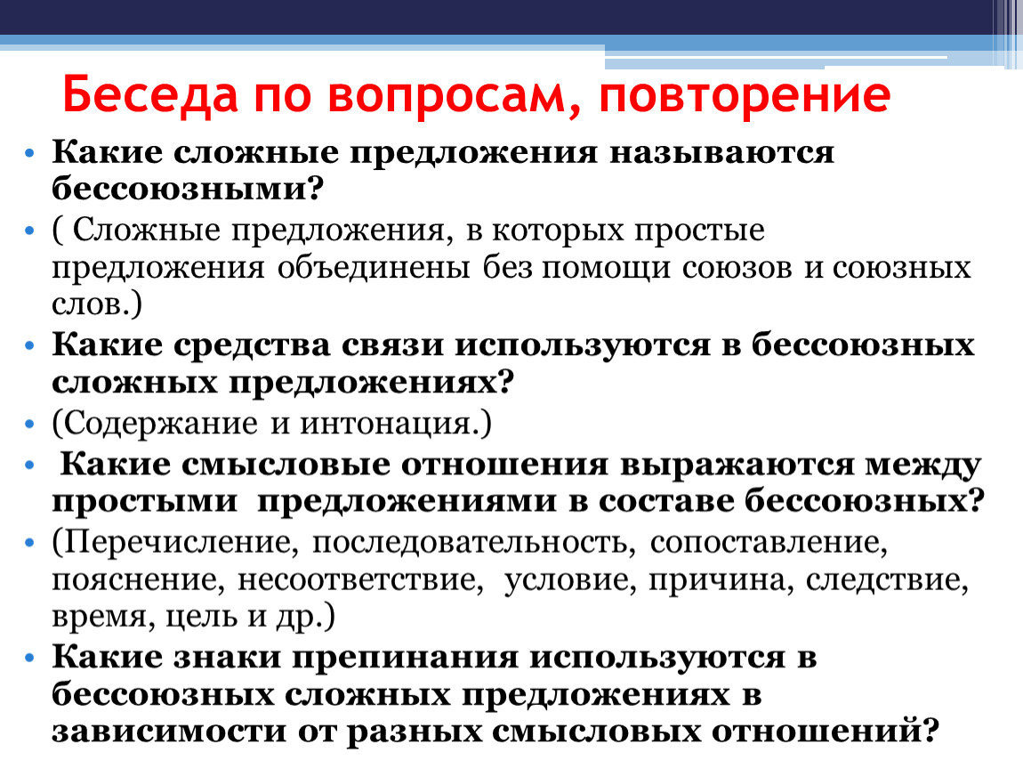 Части бессоюзного сложного предложения формально независимы, самостоятельны, равноправны, однако есть некая внутренняя зависимость, которую можно установить исходя из смысла предложений. Уловив логическую ними, почувствовав верную интонацию, нетрудно со знаками препинания. Между частями бессоюзного сложного предложения можно поставить союзы, иногда от одного к другому можно задать вопрос. Выбор знака помогает определить соответствующая интонация. Точка с запятой требует несколько большей паузы, чем запятая; перед двоеточием интонация понижается, как в конце предложения; перед тире — повышается, остается незавершённой.