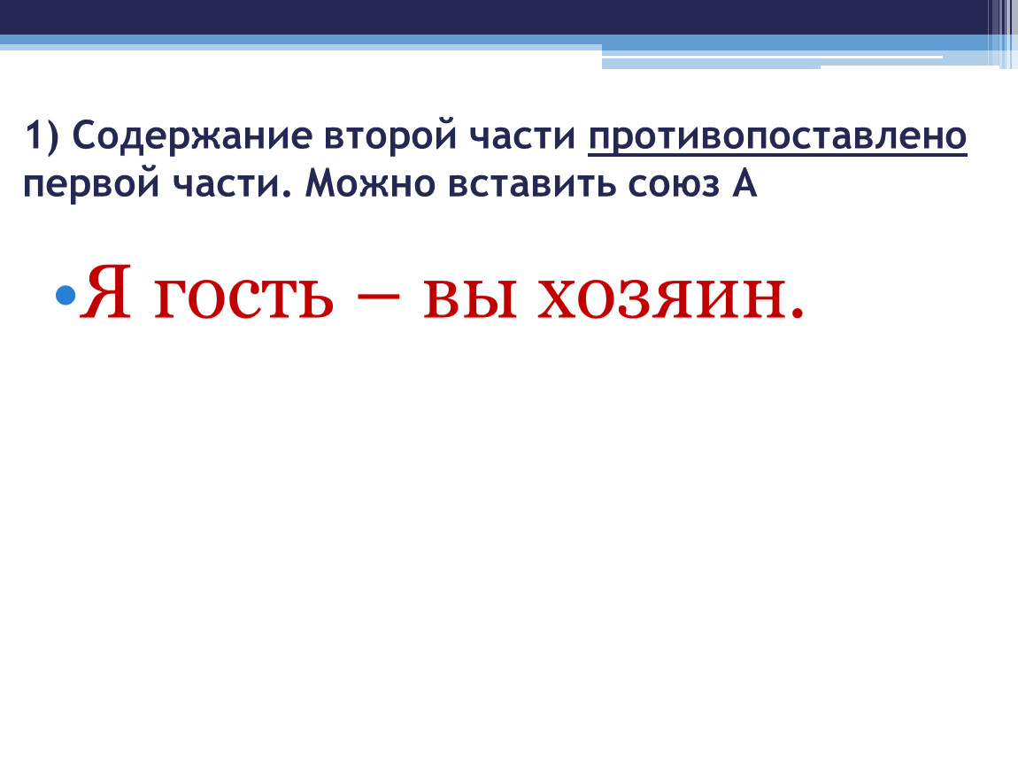 1) Содержание второй части противопоставлено первой части. Можно вставить союз А
