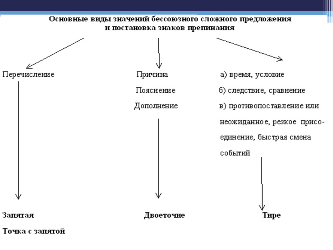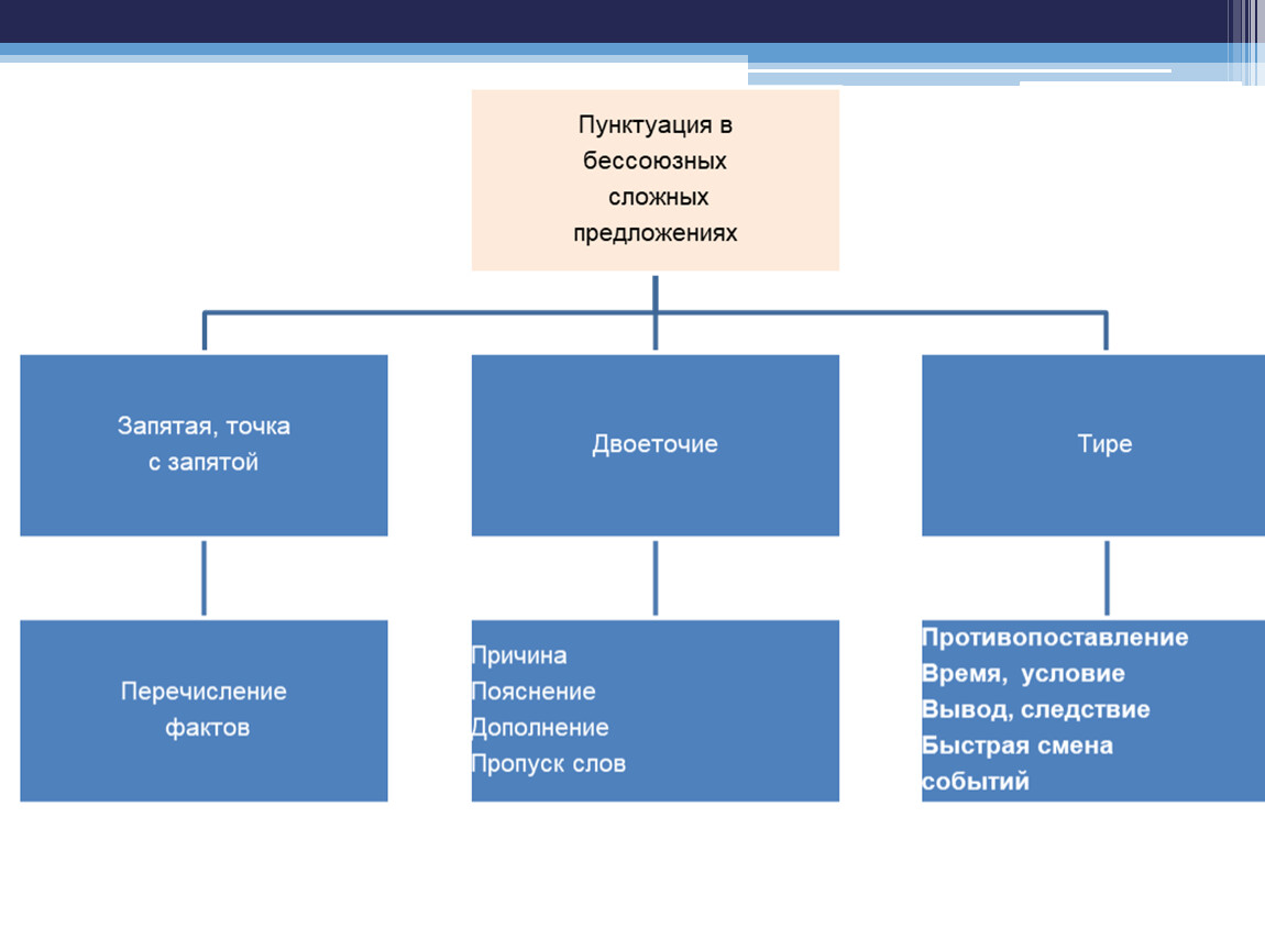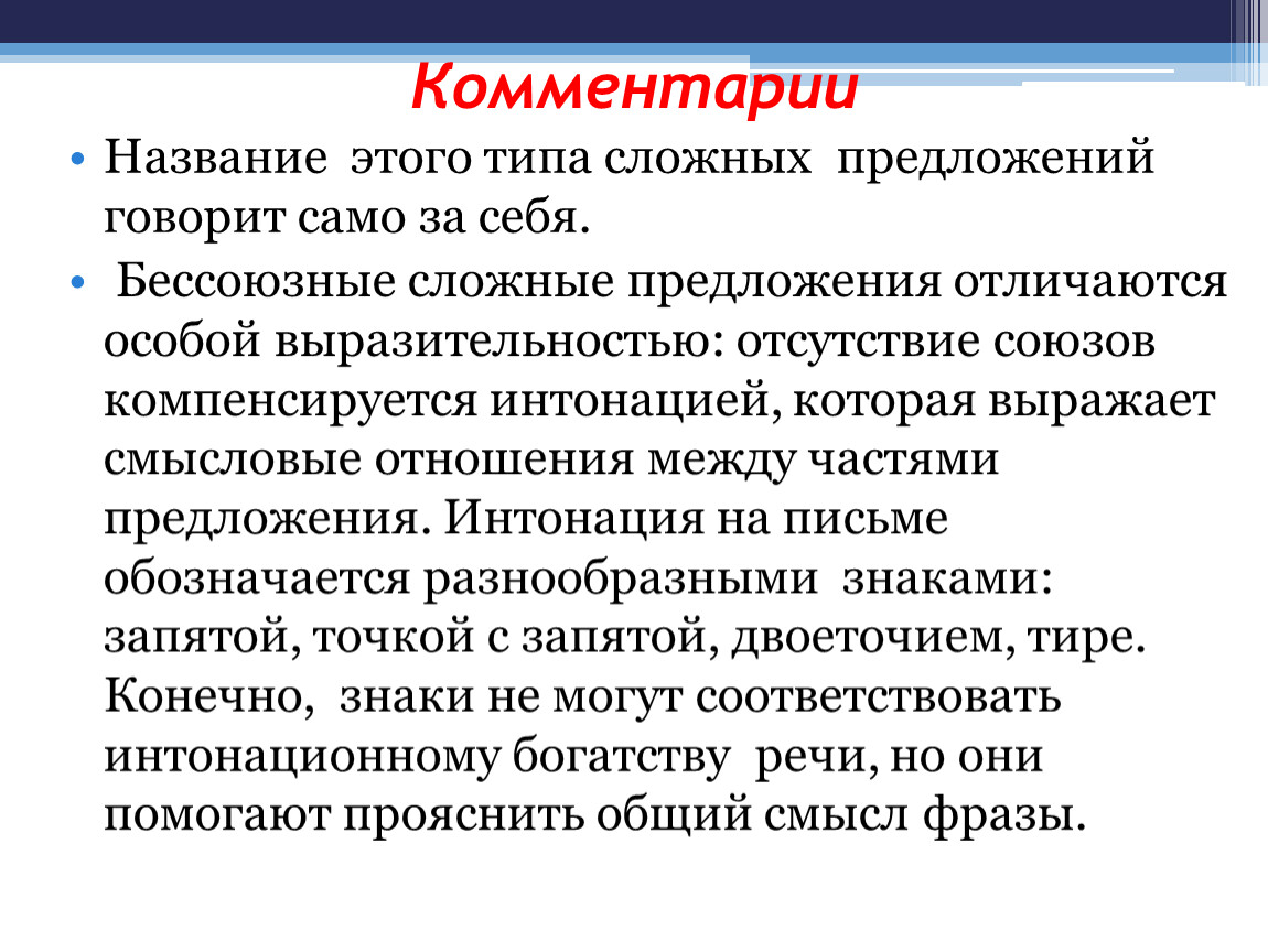 Бессоюзные сложные предложения отличаются особой выразительностью: отсутствие союзов компенсируется интонацией, которая выражает смысловые отношения между частями предложения. Интонация на письме обозначается разнообразными знаками: запятой, точкой с запятой, двоеточием, тире. Конечно, знаки не могут соответствовать интонационному богатству речи, но они помогают прояснить общий смысл фразы.