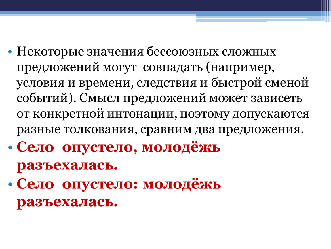 Некоторые значения бессоюзных сложных предложений могут совпадать (например, условия и времени, следствия и быстрой сменой событий). Смысл предложений может зависеть от конкретной интонации, поэтому допускаются разные толкования, сравним два предложения.