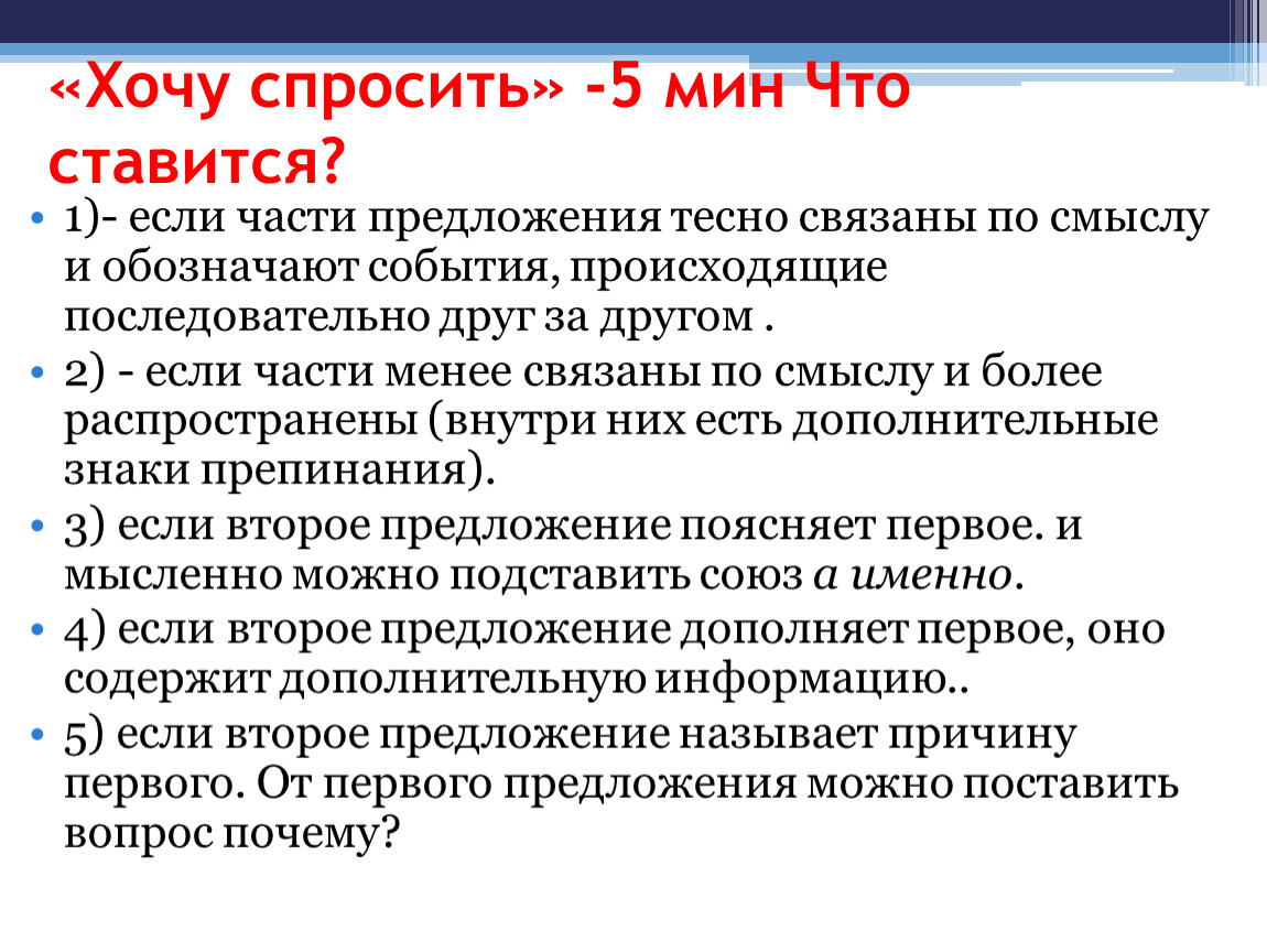5) если второе предложение называет причину первого. От первого предложения можно поставить вопрос почему?