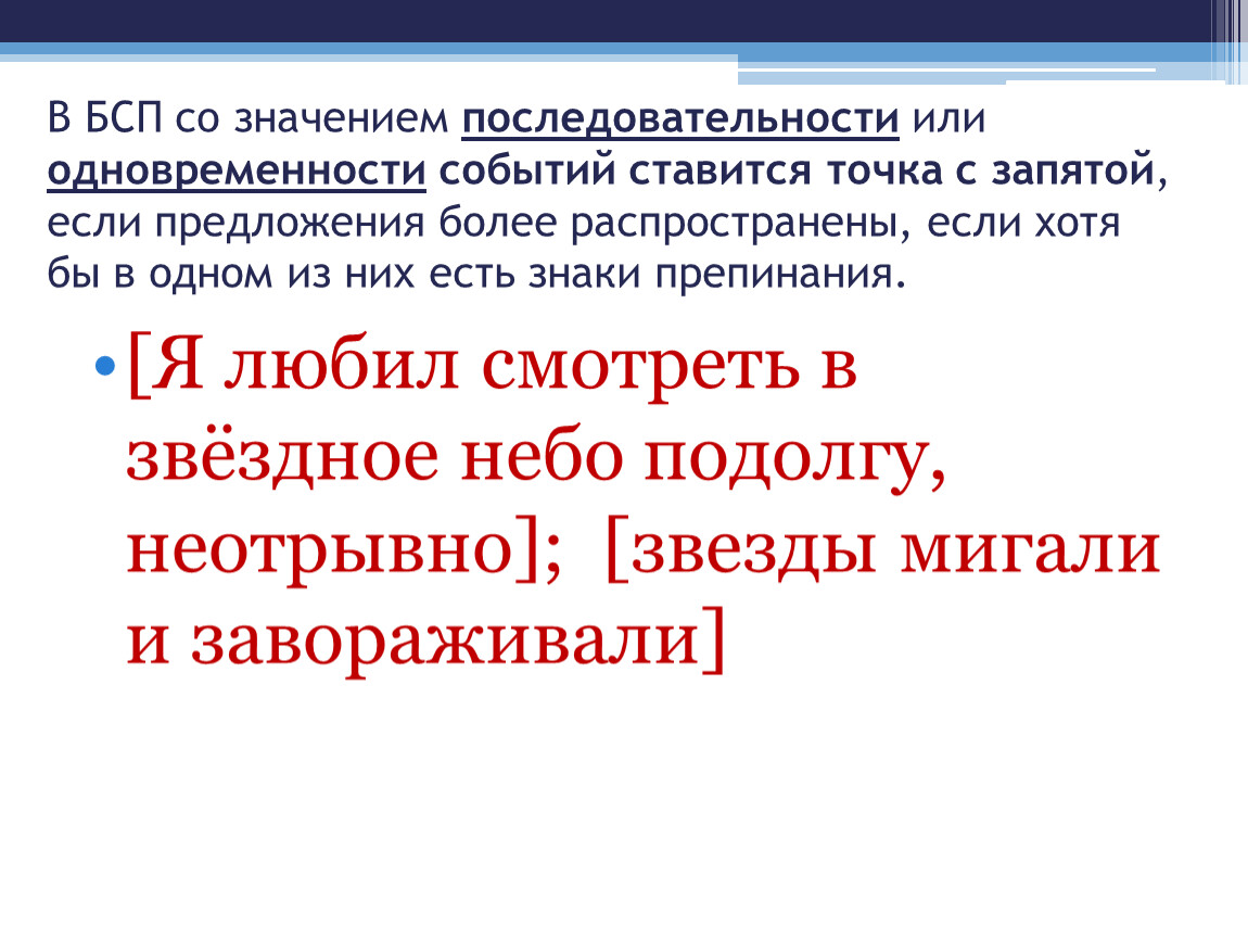 В БСП со значением последовательности или одновременности событий ставится точка с запятой, если предложения более распространены, если хотя бы в одном из них есть знаки препинания.
