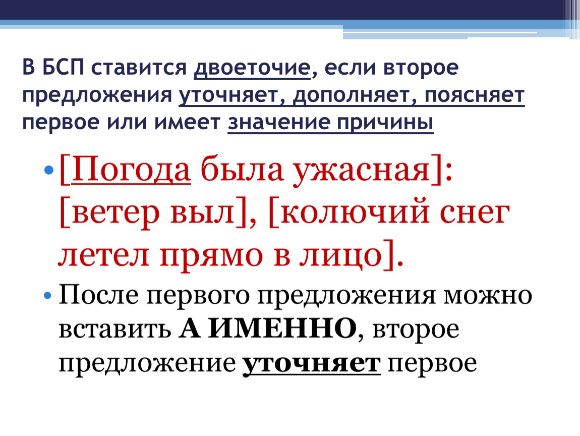 В БСП ставится двоеточие, если второе предложения уточняет, дополняет, поясняет первое или имеет значение причины