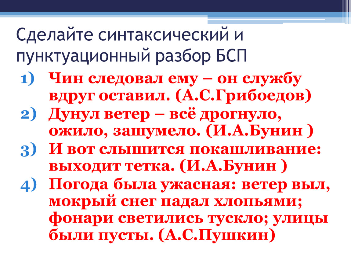 Погода была ужасная: ветер выл, мокрый снег падал хлопьями; фонари светились тускло; улицы были пусты. (А.С.Пушкин)