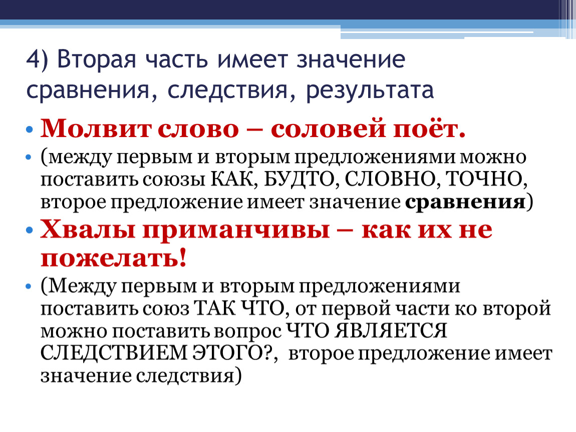 4) Вторая часть имеет значение сравнения, следствия, результата