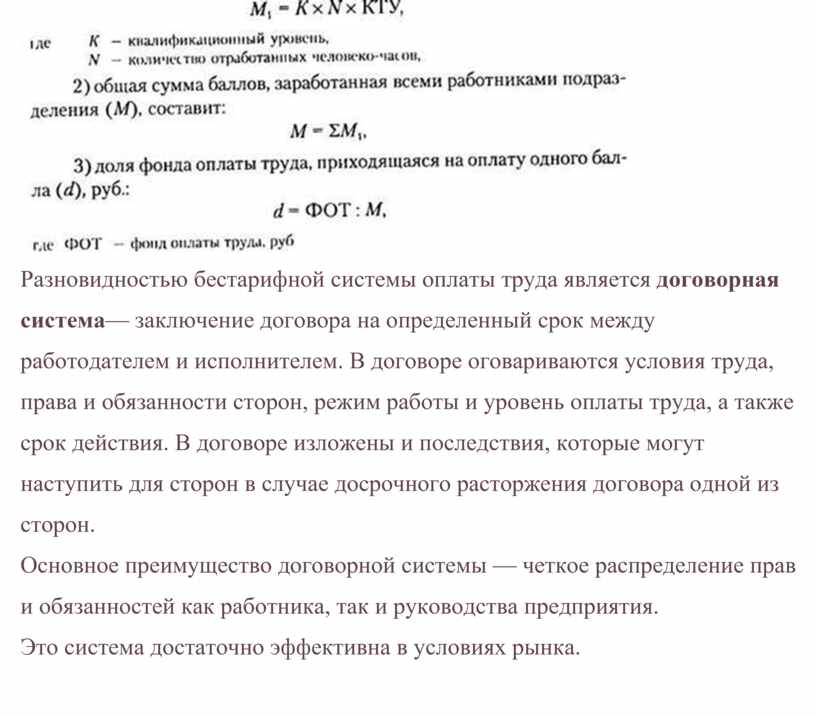 Разновидностью бестарифной системы оплаты труда является договорная система— заключение договора на определенный срок между работодателем и исполнителем. В договоре оговариваются условия труда, права и обязанности сторон, режим работы и уровень оплаты труда, а также срок действия. В договоре изложены и последствия, которые могут наступить для сторон в случае досрочного расторжения договора одной из сторон.