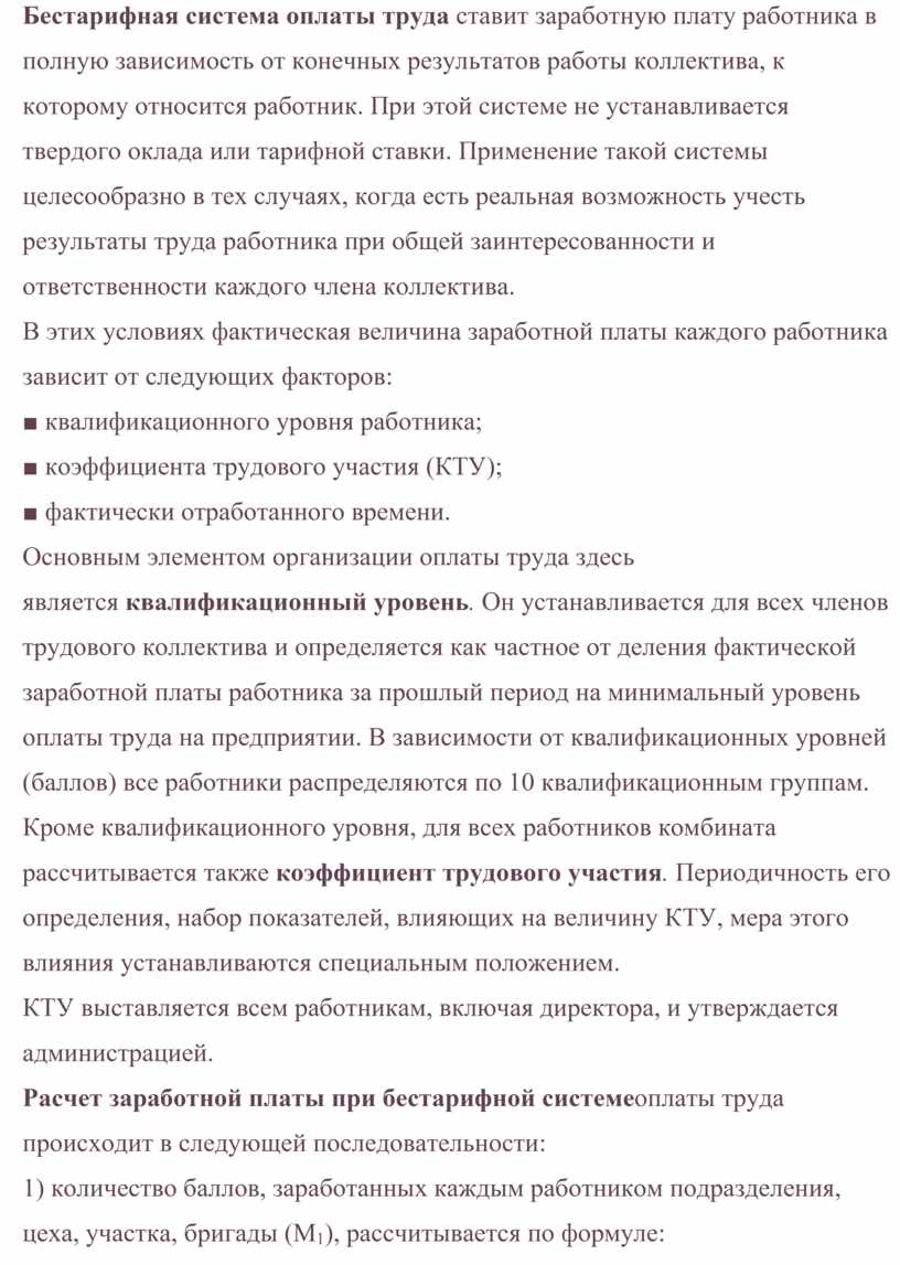 Бестарифная система оплаты труда ставит заработную плату работника в полную зависимость от конечных результатов работы коллектива, к которому относится работник. При этой системе не устанавливается твердого оклада или тарифной ставки. Применение такой системы целесообразно в тех случаях, когда есть реальная возможность учесть результаты труда работника при общей заинтересованности и ответственности каждого члена коллектива.