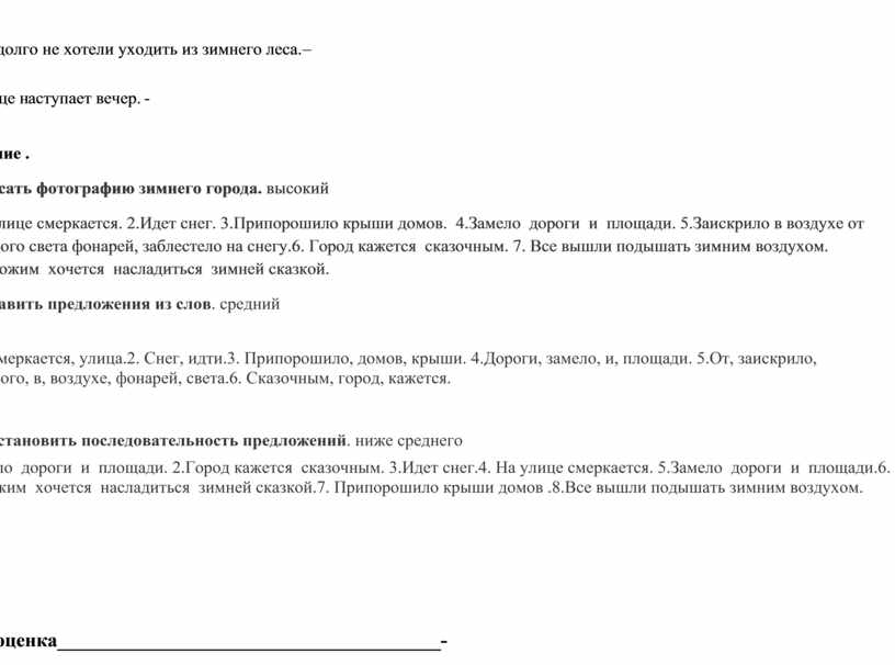 1) 1.Описать фотографию зимнего города,включив в описание безличные предложения ( высокий) 2) 2.Составить предложения из слов ( средний) 3) 3.Восстановить последовательность предложений ( ниже среднего) |