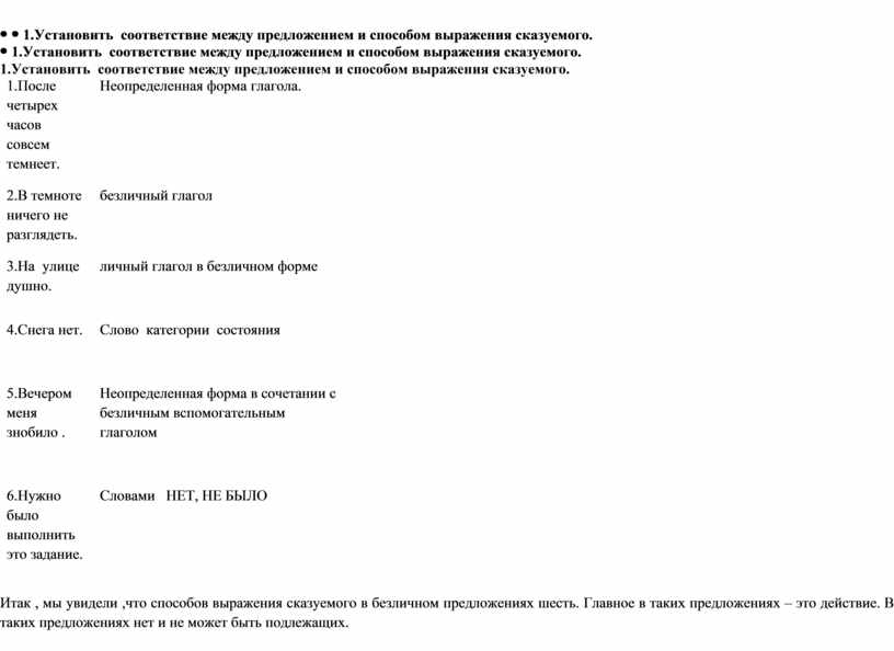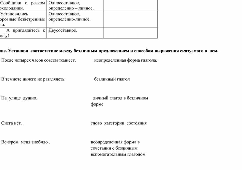 2 задание. Установи соответствие между безличным предложением и способом выражения сказуемого в нем.