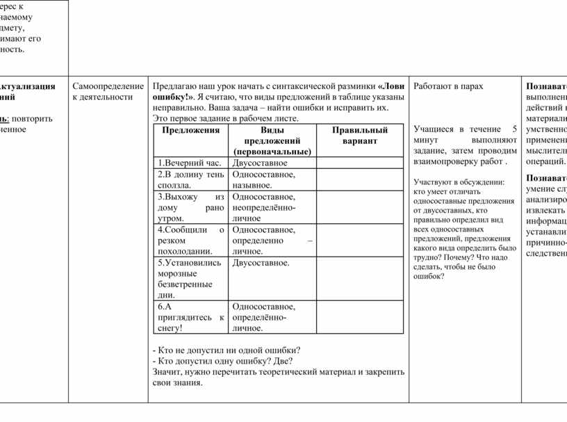 Предлагаю наш урок начать с синтаксической разминки «Лови ошибку!». Я считаю, что виды предложений в таблице указаны неправильно. Ваша задача – найти ошибки и исправить их. Это первое задание в рабочем листе.