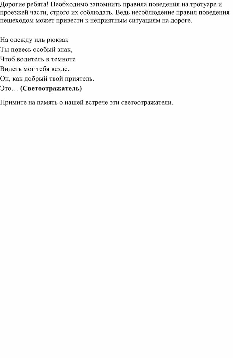 Дорогие ребята! Необходимо запомнить правила поведения на тротуаре и проезжей части, строго их соблюдать. Ведь несоблюдение правил поведения пешеходом может привести к неприятным ситуациям на дороге.