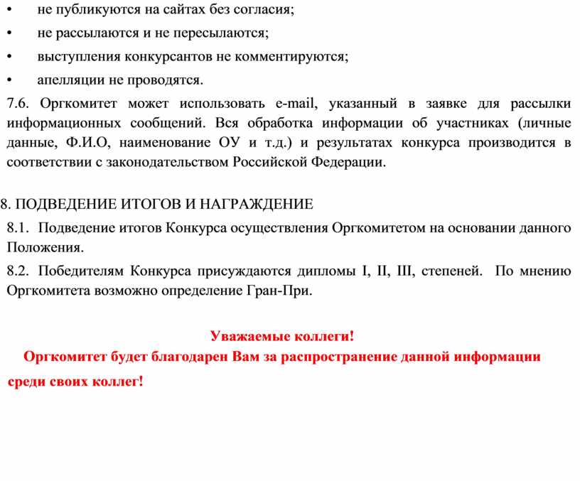 7.6. Оргкомитет может использовать e-mail, указанный в заявке для рассылки информационных сообщений. Вся обработка информации об участниках (личные данные, Ф.И.О, наименование ОУ и т.д.) и результатах конкурса производится в соответствии с законодательством Российской Федерации.