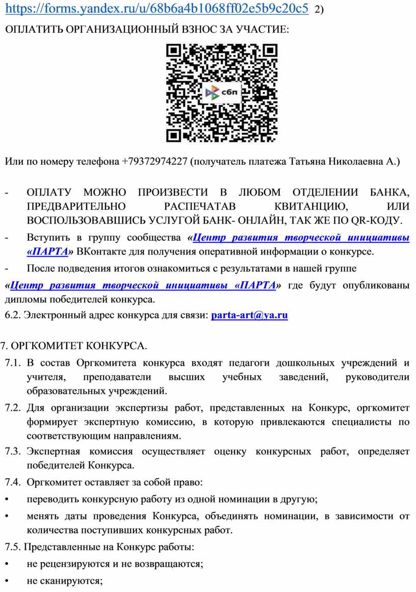 https://forms.yandex.ru/u/68b6a4b1068ff02e5b9c20c5 2) ОПЛАТИТЬ ОРГАНИЗАЦИОННЫЙ ВЗНОС ЗА УЧАСТИЕ: