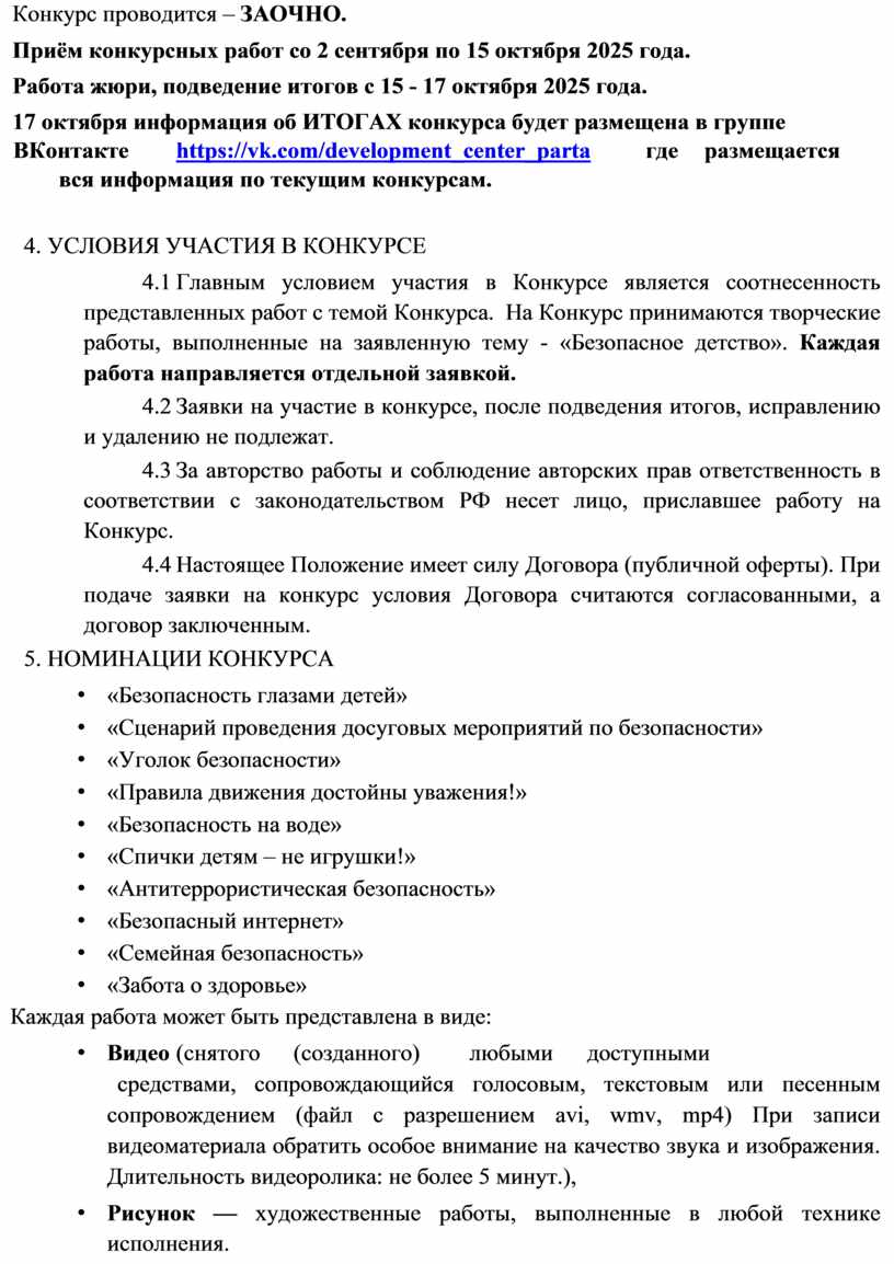 1. ОСНОВНЫЕ ПОЛОЖЕНИЯ 1.1 Настоящее Положение определяет порядок организации и проведения Всероссийского творческого конкурса в рамках месячника безопасности «Безопасное детство» (далее - Конкурс) среди детей, их родителей и педагогов, его организационное и финансовое обеспечение, а также порядок участия в Конкурсе, требования к конкурсным работам, определение и награждение победителей.