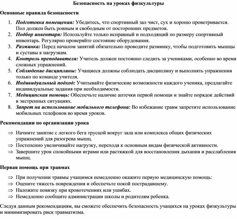 Следуя данным рекомендациям, вы сможете обеспечить безопасность учащихся на уроках физкультуры и минимизировать риск травматизма.