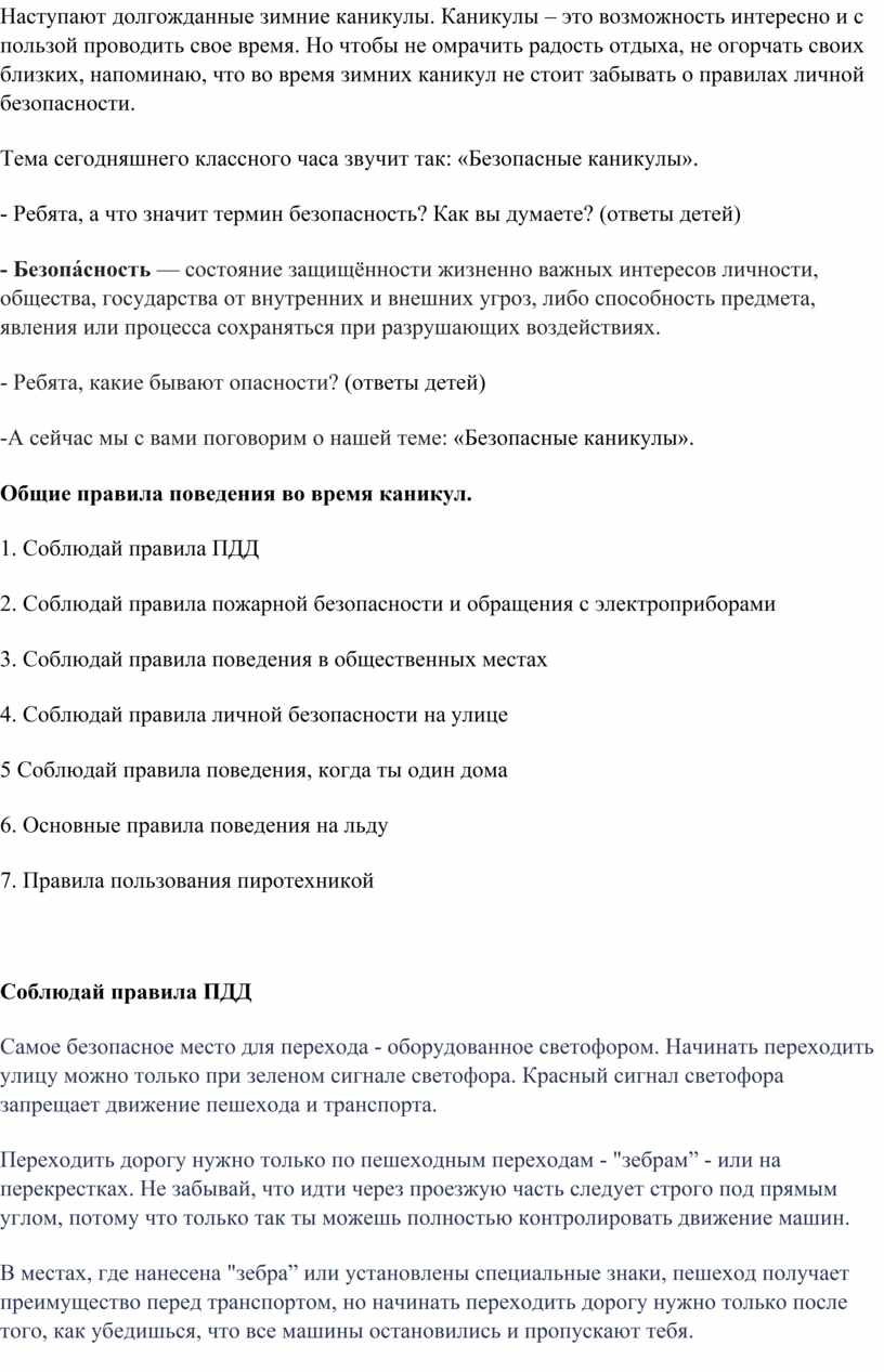 Общие правила поведения во время каникул.