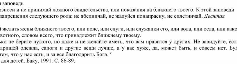 Не произноси и не принимай ложного свидетельства, или показания на ближнего твоего. К этой заповеди относятся запрещения следующего рода: не ябедничай, не жалуйся понапрасну, не сплетничай. Десятая заповедь