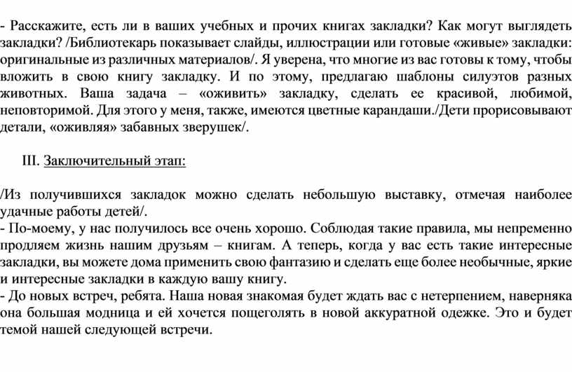 - По-моему, у нас получилось все очень хорошо. Соблюдая такие правила, мы непременно продляем жизнь нашим друзьям – книгам. А теперь, когда у вас есть такие интересные закладки, вы можете дома применить свою фантазию и сделать еще более необычные, яркие и интересные закладки в каждую вашу книгу.