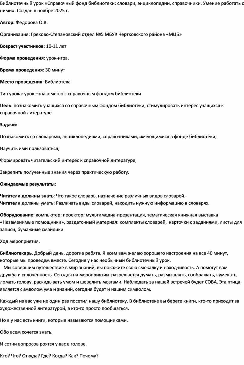 Библиотечный урок «Справочный фонд библиотеки: словари, энциклопедии, справочники. Умение работать с ними». Создан в ноябре 2025 г.