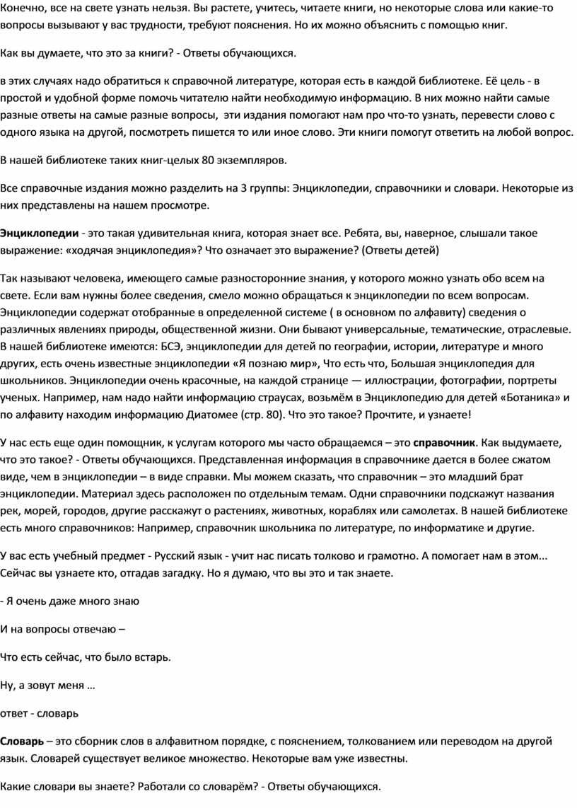 У нас есть еще один помощник, к услугам которого мы часто обращаемся – это справочник. Как выдумаете, что это такое? - Ответы обучающихся. Представленная информация в справочнике дается в более сжатом виде, чем в энциклопедии – в виде справки. Мы можем сказать, что справочник – это младший брат энциклопедии. Материал здесь расположен по отдельным темам. Одни справочники подскажут названия рек, морей, городов, другие расскажут о растениях, животных, кораблях или самолетах. В нашей библиотеке есть много справочников: Например, справочник школьника по литературе, по информатике и другие.