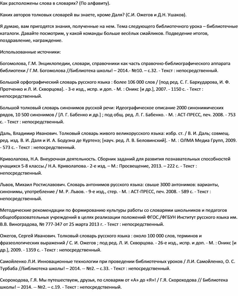 Скороходова, Г.Я. Мы путешествуем, друзья, по словарям от «А» до «Я»! / Г.Я. Скороходова // Библиотека школы! – 2014. -- №2. – с.19. - Текст : непосредственный.