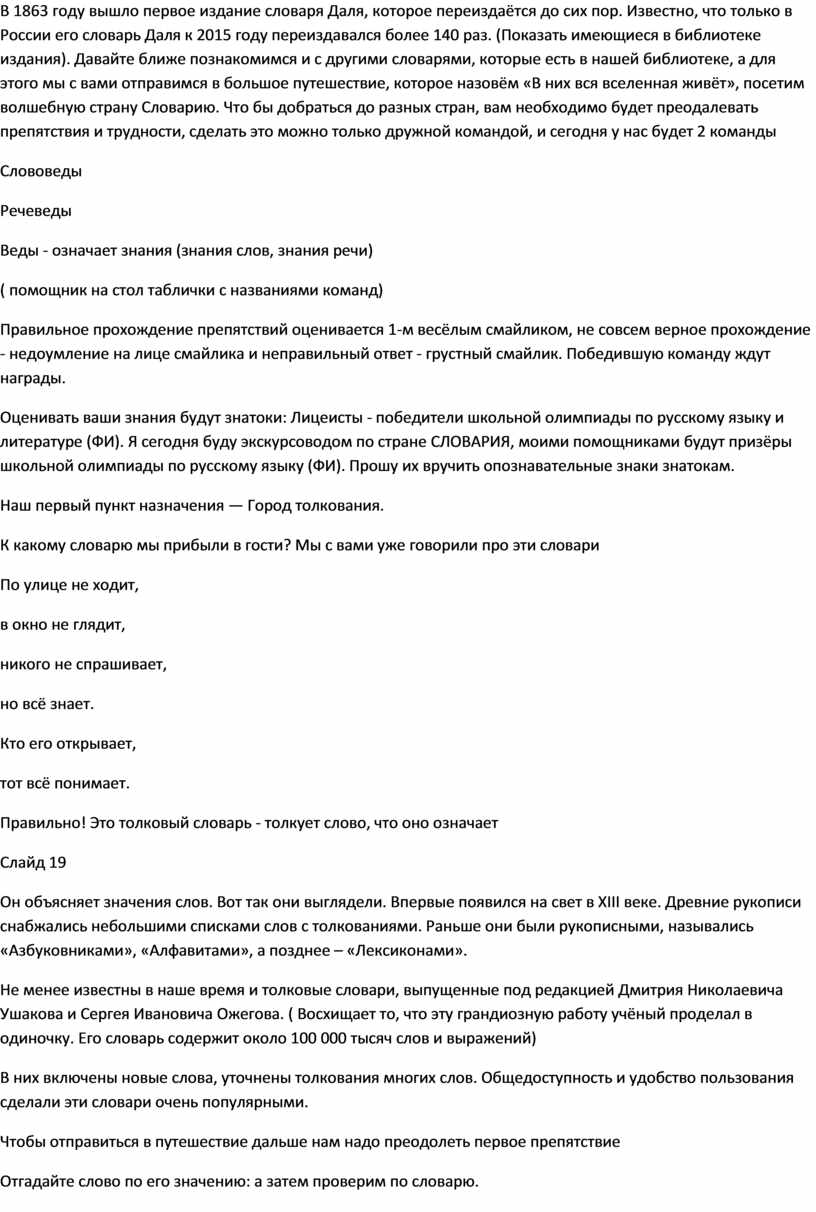 В 1863 году вышло первое издание словаря Даля, которое переиздаётся до сих пор. Известно, что только в России его словарь Даля к 2015 году переиздавался более 140 раз. (Показать имеющиеся в библиотеке издания). Давайте ближе познакомимся и с другими словарями, которые есть в нашей библиотеке, а для этого мы с вами отправимся в большое путешествие, которое назовём «В них вся вселенная живёт», посетим волшебную страну Словарию. Что бы добраться до разных стран, вам необходимо будет преодалевать препятствия и трудности, сделать это можно только дружной командой, и сегодня у нас будет 2 команды