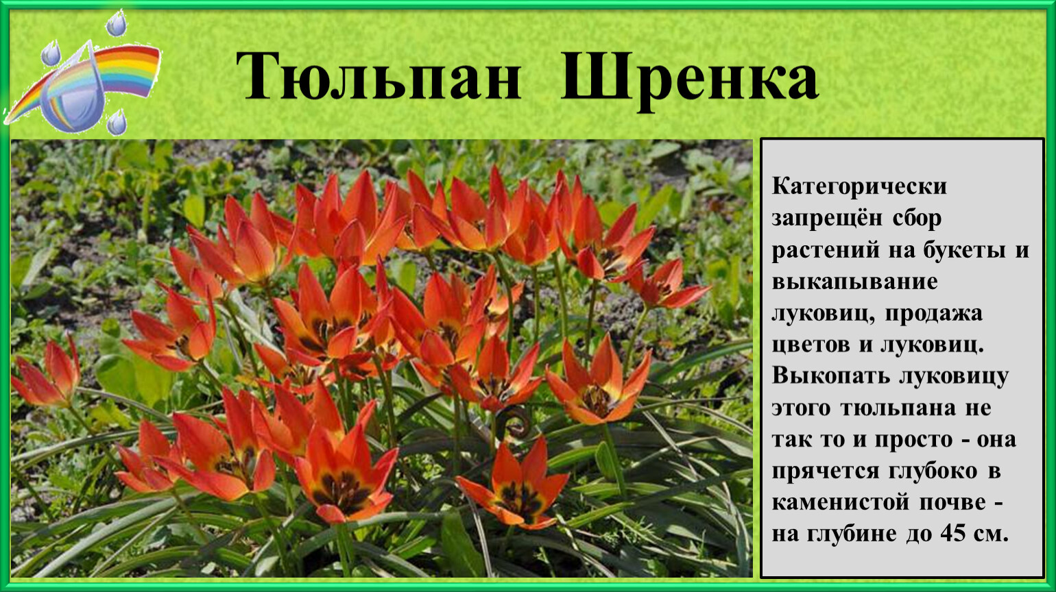 Категорически запрещён сбор растений на букеты и выкапывание луковиц, продажа цветов и луковиц.Выкопать луковицу этого тюльпана не так то и просто - она прячется глубоко в каменистой почве - на глубине до 45 см.