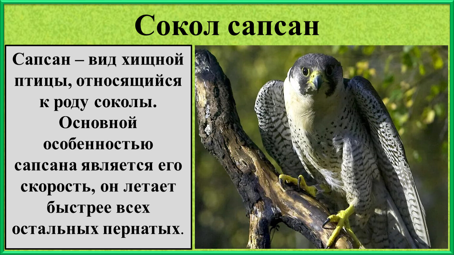 Сапсан – вид хищной птицы, относящийся к роду соколы. Основной особенностью сапсана является его скорость, он летает быстрее всех остальных пернатых.