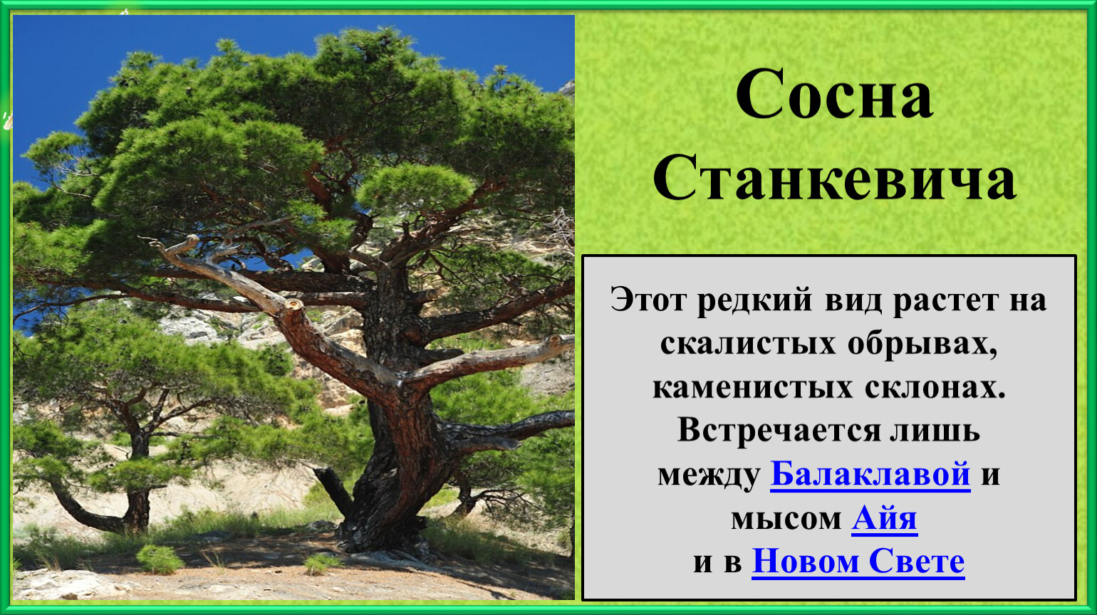 Сосна пицундская - семейство сосновых, относится к уязвимому виду растений. Место обитания Черноморское побережье Кавказа.