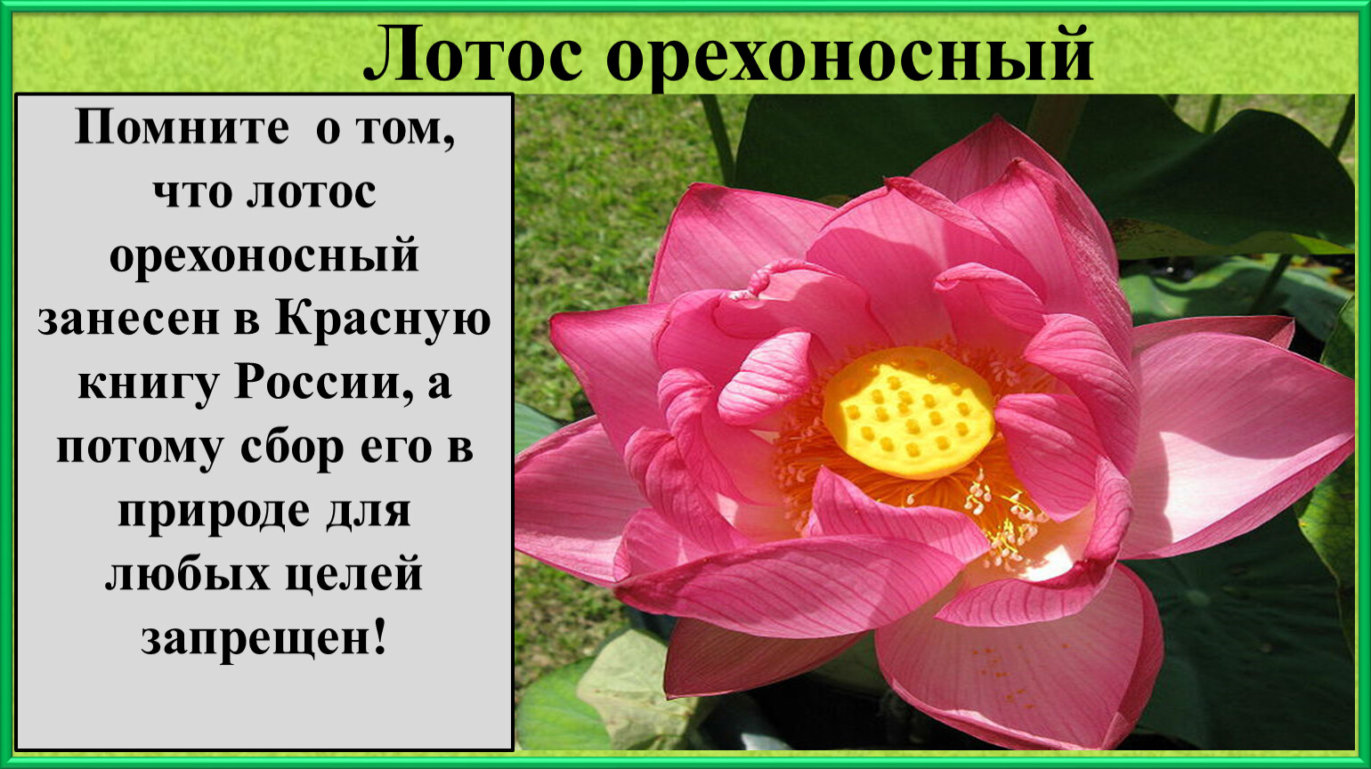Помните о том, что лотос орехоносный занесен в Красную книгу России, а потому сбор его в природе для любых целей запрещен!