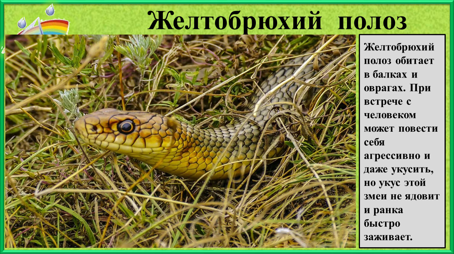 Желтобрюхий полоз обитает в балках и оврагах. При встрече с человеком может повести себя агрессивно и даже укусить, но укус этой змеи не ядовит и ранка быстро заживает.