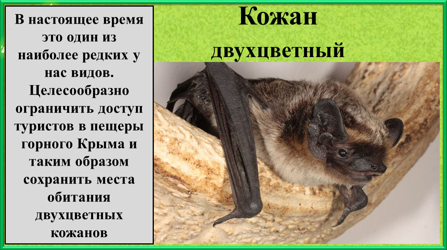 В настоящее время это один из наиболее редких у нас видов. Целесообразно ограничить доступ туристов в пещеры горного Крыма и таким образом сохранить места обитания двухцветных кожанов