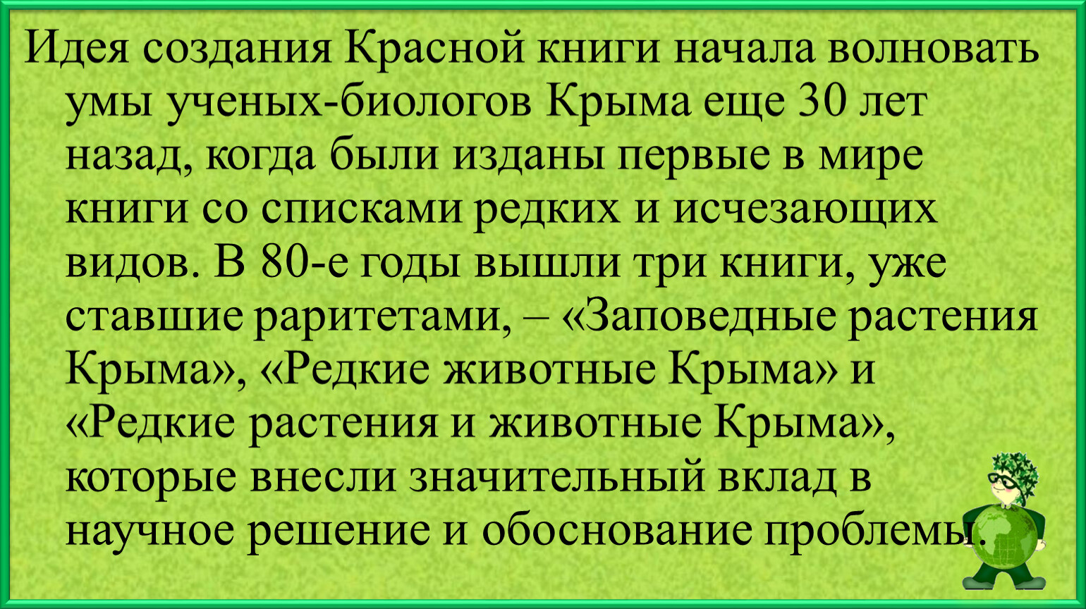 Идея создания Красной книги начала волновать умы ученых-биологов Крыма еще 30 лет назад, когда были изданы первые в мире книги со списками редких и исчезающих видов. В 80-е годы вышли три книги, уже ставшие раритетами, – «Заповедные растения Крыма», «Редкие животные Крыма» и «Редкие растения и животные Крыма», которые внесли значительный вклад в научное решение и обоснование проблемы.