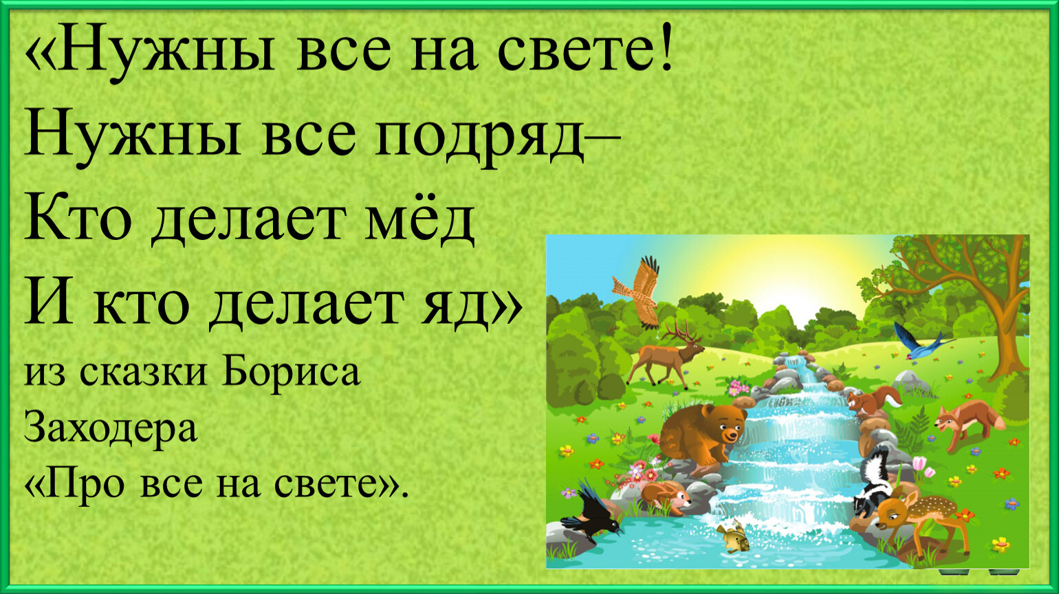 «Нужны все на свете!Нужны все подряд–Кто делает мёдИ кто делает яд»из сказки Бориса Заходера «Про все на свете».
