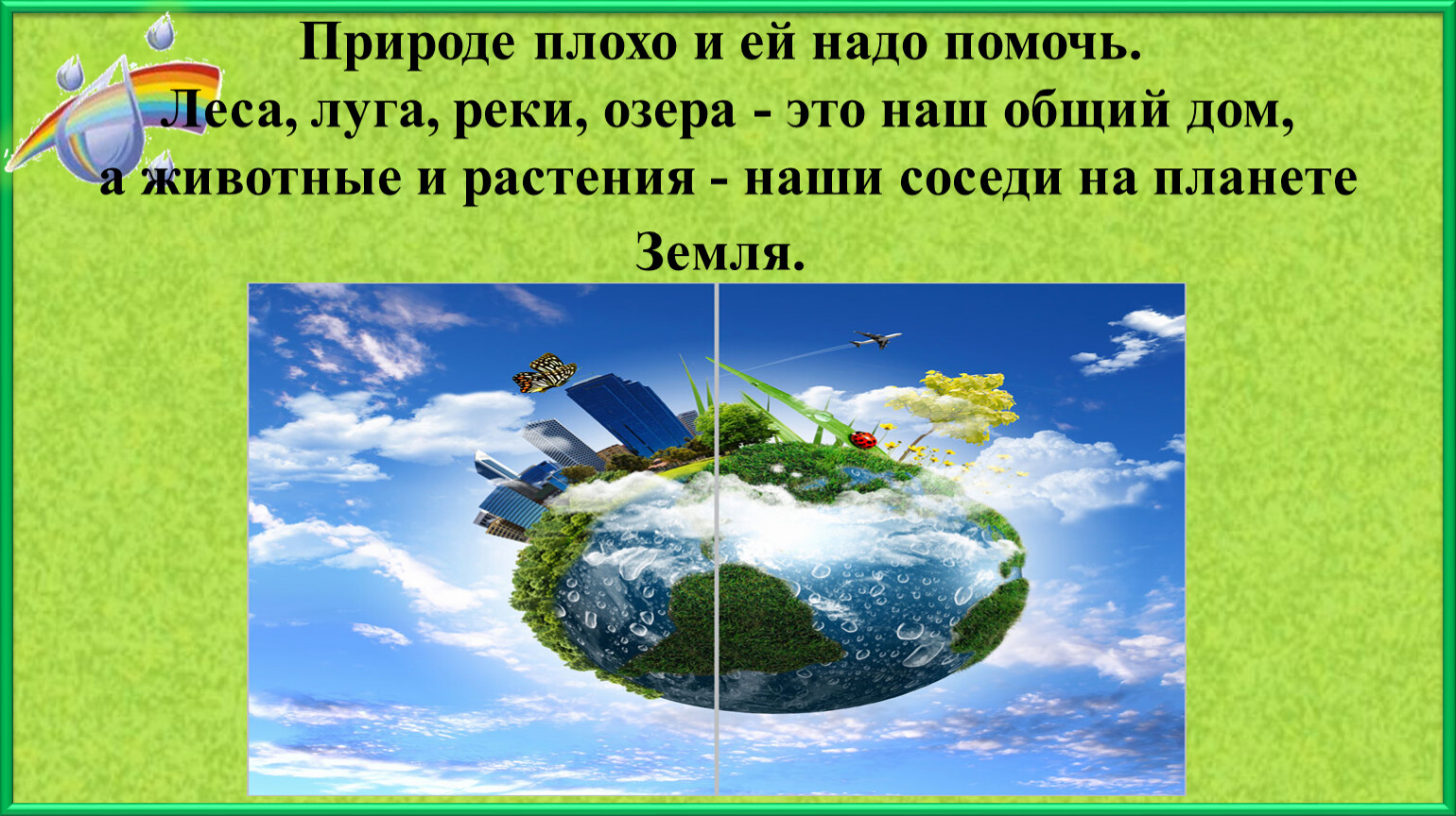 Природе плохо и ей надо помочь. Леса, луга, реки, озера - это наш общий дом, а животные и растения - наши соседи на планете Земля.