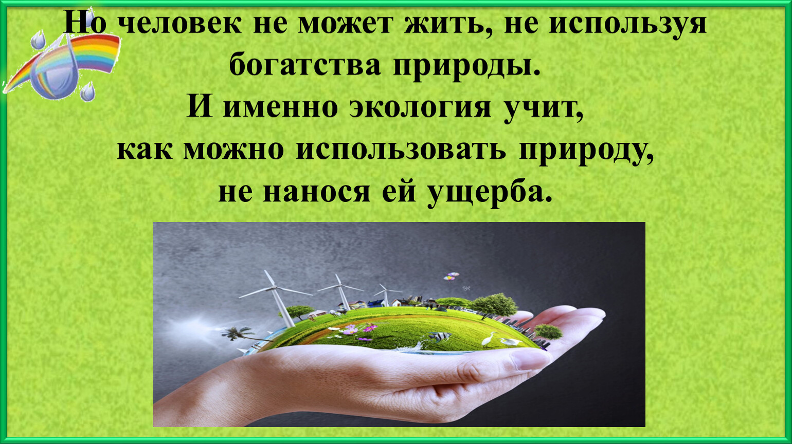 Но человек не может жить, не используя богатства природы. И именно экология учит, как можно использовать природу, не нанося ей ущерба.