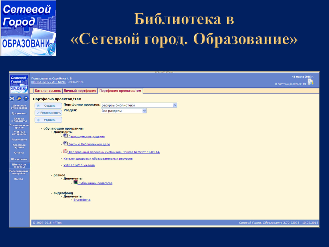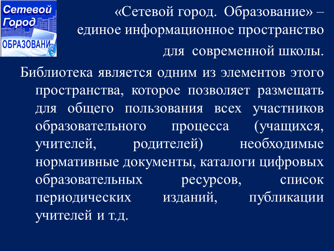 Библиотека является одним из элементов этого пространства, которое позволяет размещать для общего пользования всех участников образовательного процесса (учащихся, учителей, родителей) необходимые нормативные документы, каталоги цифровых образовательных ресурсов, список периодических изданий, публикации учителей и т.д.