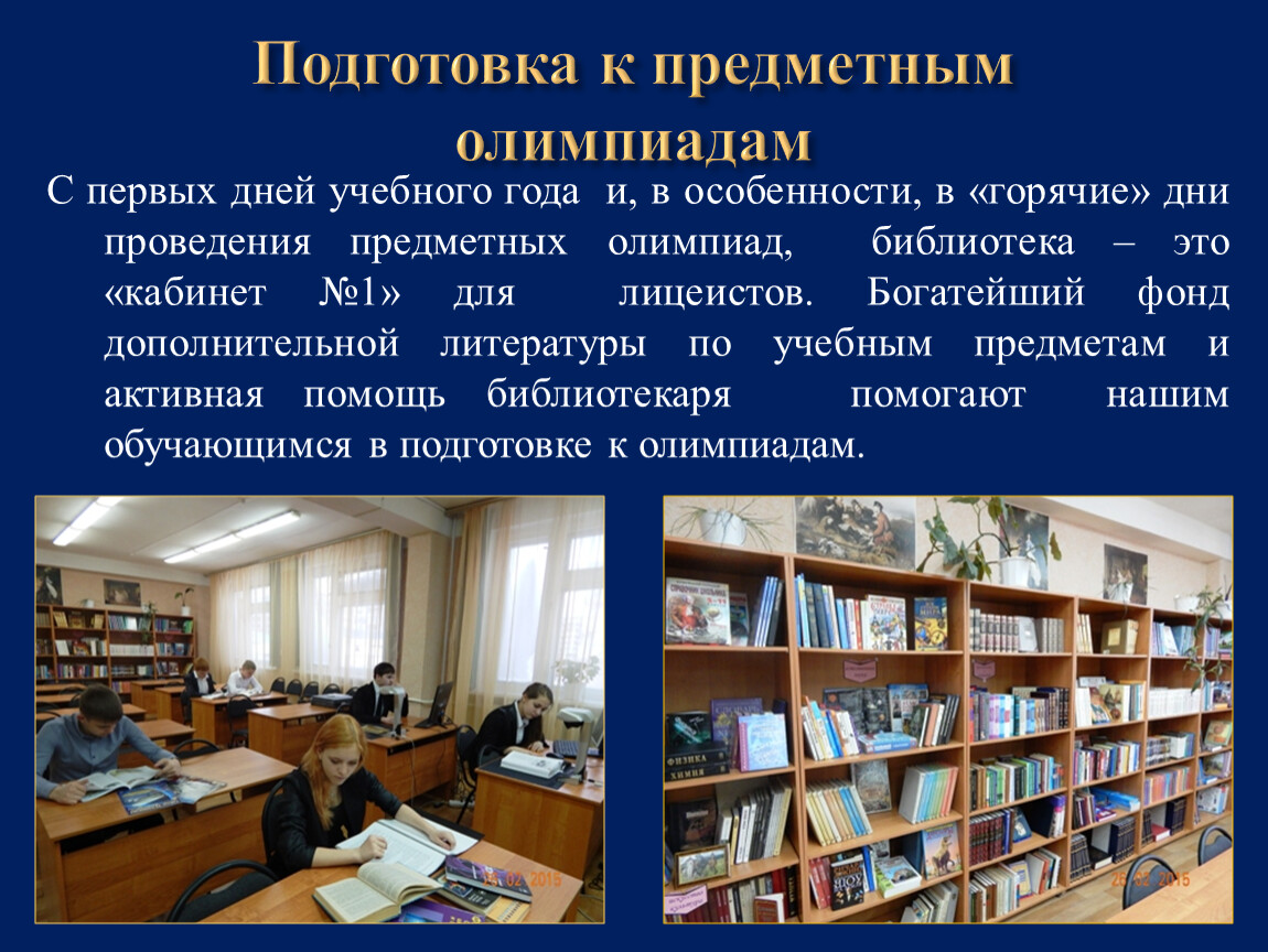 С первых дней учебного года и, в особенности, в «горячие» дни проведения предметных олимпиад, библиотека – это «кабинет №1» для лицеистов. Богатейший фонд дополнительной литературы по учебным предметам и активная помощь библиотекаря помогают нашим обучающимся в подготовке к олимпиадам.