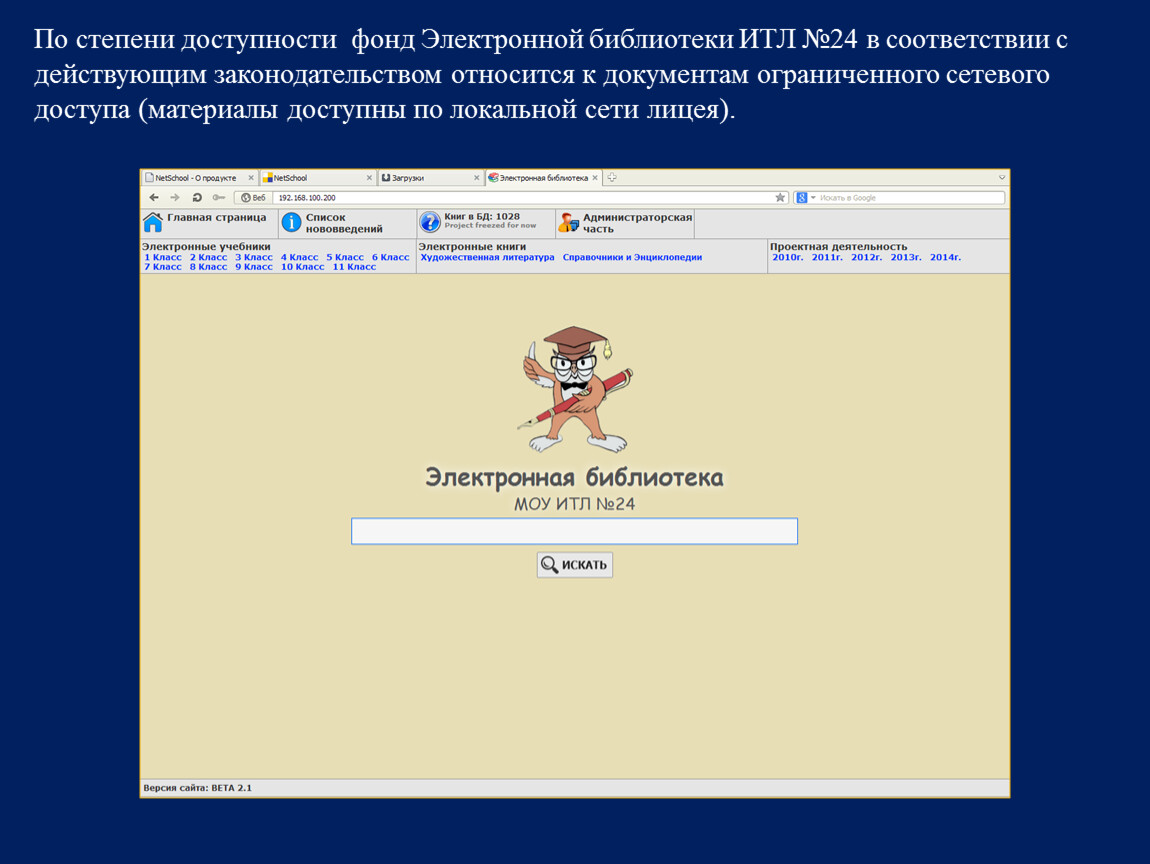 По степени доступности фонд Электронной библиотеки ИТЛ №24 в соответствии с действующим законодательством относится к документам ограниченного сетевого доступа (материалы доступны по локальной сети лицея).
