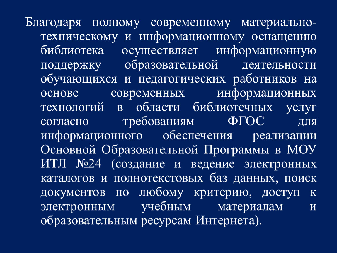Благодаря полному современному материально-техническому и информационному оснащению библиотека осуществляет информационную поддержку образовательной деятельности обучающихся и педагогических работников на основе современных информационных технологий в области библиотечных услуг согласно требованиям ФГОС для информационного обеспечения реализации Основной Образовательной Программы в МОУ ИТЛ №24 (создание и ведение электронных каталогов и полнотекстовых баз данных, поиск документов по любому критерию, доступ к электронным учебным материалам и образовательным ресурсам Интернета).