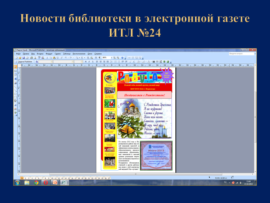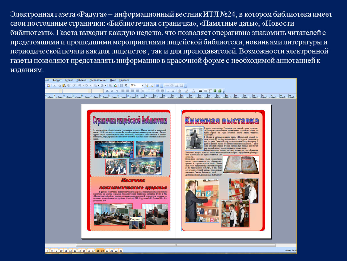 Электронная газета «Радуга» – информационный вестник ИТЛ №24, в котором библиотека имеет свои постоянные странички: «Библиотечная страничка», «Памятные даты», «Новости библиотеки». Газета выходит каждую неделю, что позволяет оперативно знакомить читателей с предстоящими и прошедшими мероприятиями лицейской библиотеки, новинками литературы и периодической печати как для лицеистов , так и для преподавателей. Возможности электронной газеты позволяют представлять информацию в красочной форме с необходимой аннотацией к изданиям.