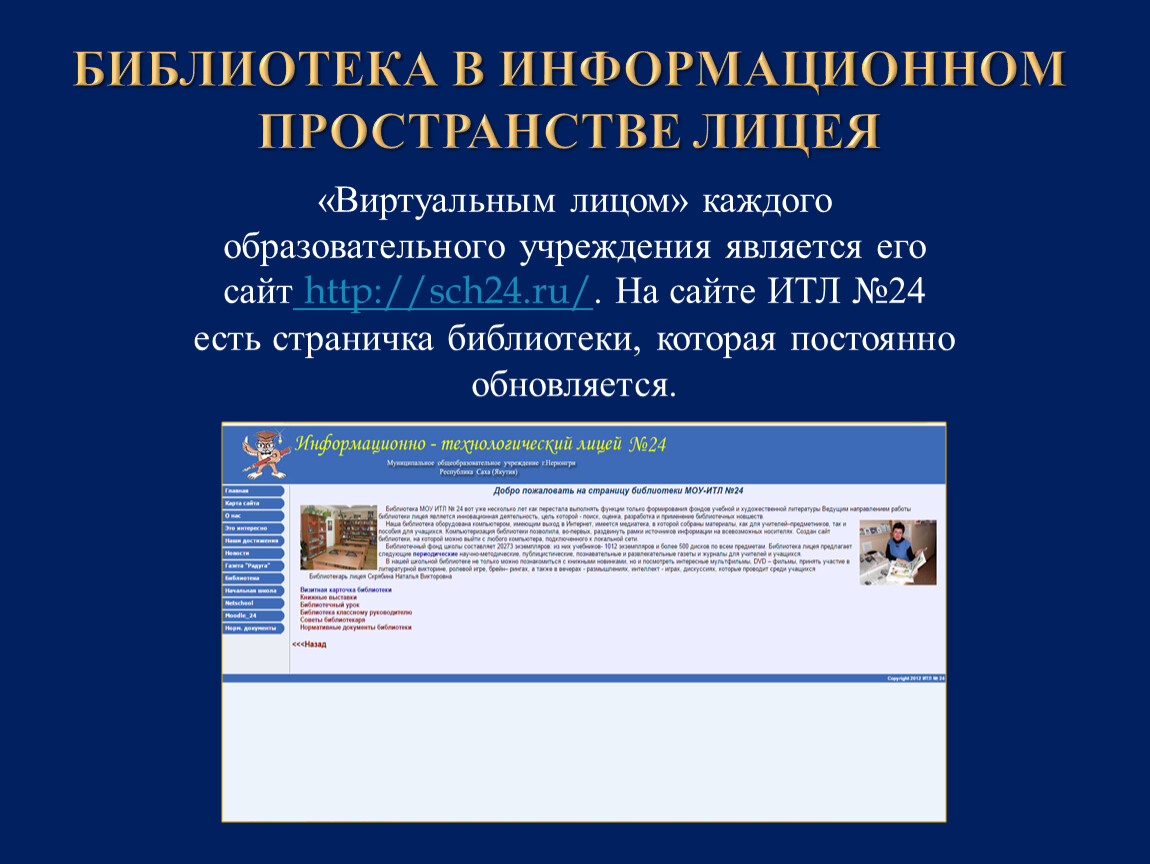 «Виртуальным лицом» каждого образовательного учреждения является его сайт http://sch24.ru/. На сайте ИТЛ №24 есть страничка библиотеки, которая постоянно обновляется.