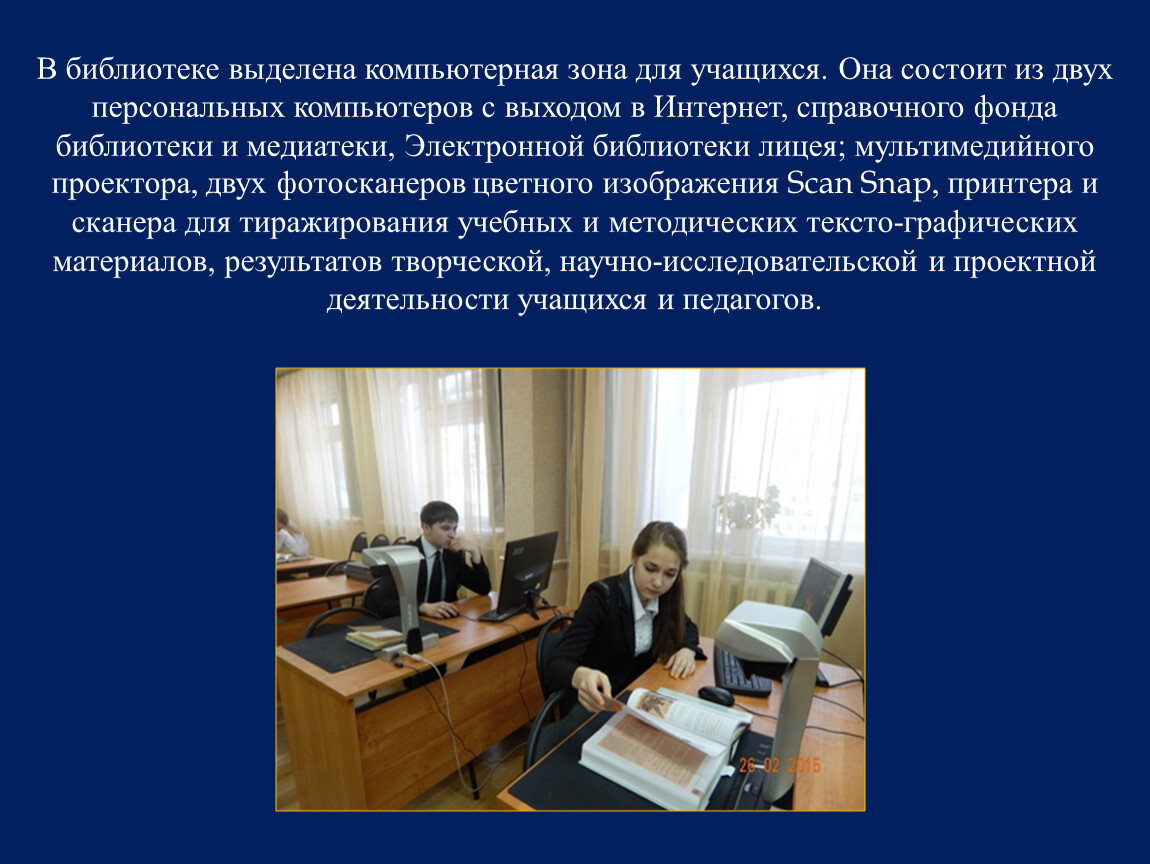 В библиотеке выделена компьютерная зона для учащихся. Она состоит из двух персональных компьютеров с выходом в Интернет, справочного фонда библиотеки и медиатеки, Электронной библиотеки лицея; мультимедийного проектора, двух фотосканеров цветного изображения Scan Snap, принтера и сканера для тиражирования учебных и методических тексто-графических материалов, результатов творческой, научно-исследовательской и проектной деятельности учащихся и педагогов.