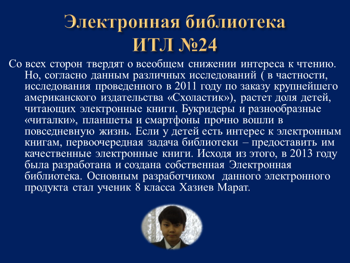 Со всех сторон твердят о всеобщем снижении интереса к чтению. Но, согласно данным различных исследований ( в частности, исследования проведенного в 2011 году по заказу крупнейшего американского издательства «Схоластик»), растет доля детей, читающих электронные книги. Букридеры и разнообразные «читалки», планшеты и смартфоны прочно вошли в повседневную жизнь. Если у детей есть интерес к электронным книгам, первоочередная задача библиотеки – предоставить им качественные электронные книги. Исходя из этого, в 2013 году была разработана и создана собственная Электронная библиотека. Основным разработчиком данного электронного продукта стал ученик 8 класса Хазиев Марат.
