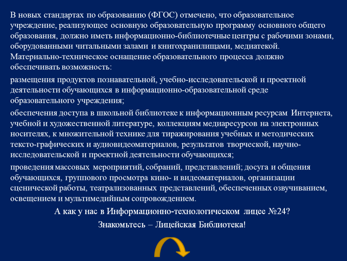 В новых стандартах по образованию (ФГОС) отмечено, что образовательное учреждение, реализующее основную образовательную программу основного общего образования, должно иметь информационно-библиотечные центры с рабочими зонами, оборудованными читальными залами и книгохранилищами, медиатекой. Материально-техническое оснащение образовательного процесса должно обеспечивать возможность:
