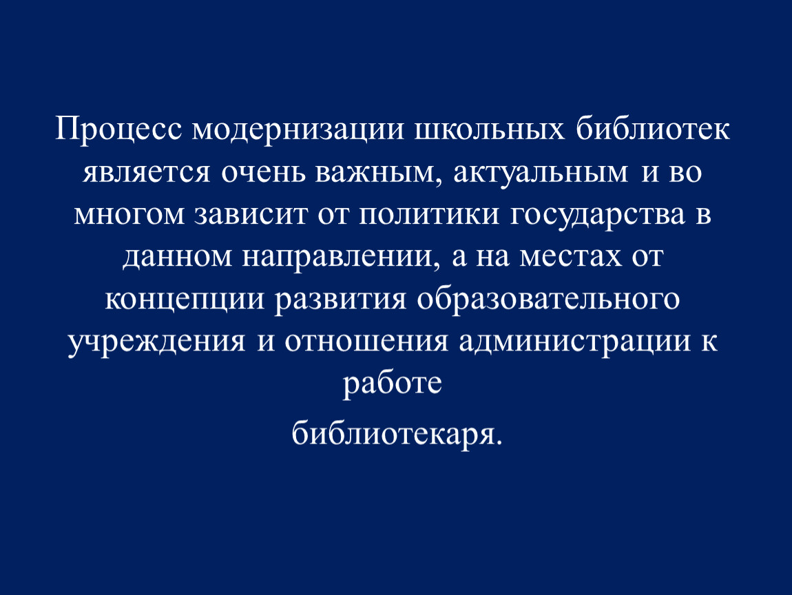 Процесс модернизации школьных библиотек является очень важным, актуальным и во многом зависит от политики государства в данном направлении, а на местах от концепции развития образовательного учреждения и отношения администрации к работе