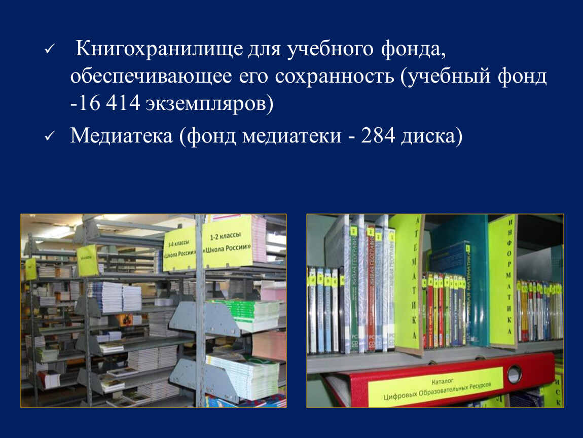 обеспечения доступа в школьной библиотеке к информационным ресурсам Интернета, учебной и художественной литературе, коллекциям медиаресурсов на электронных носителях, к множительной технике для тиражирования учебных и методических тексто-графических и аудиовидеоматериалов, результатов творческой, научно-исследовательской и проектной деятельности обучающихся;