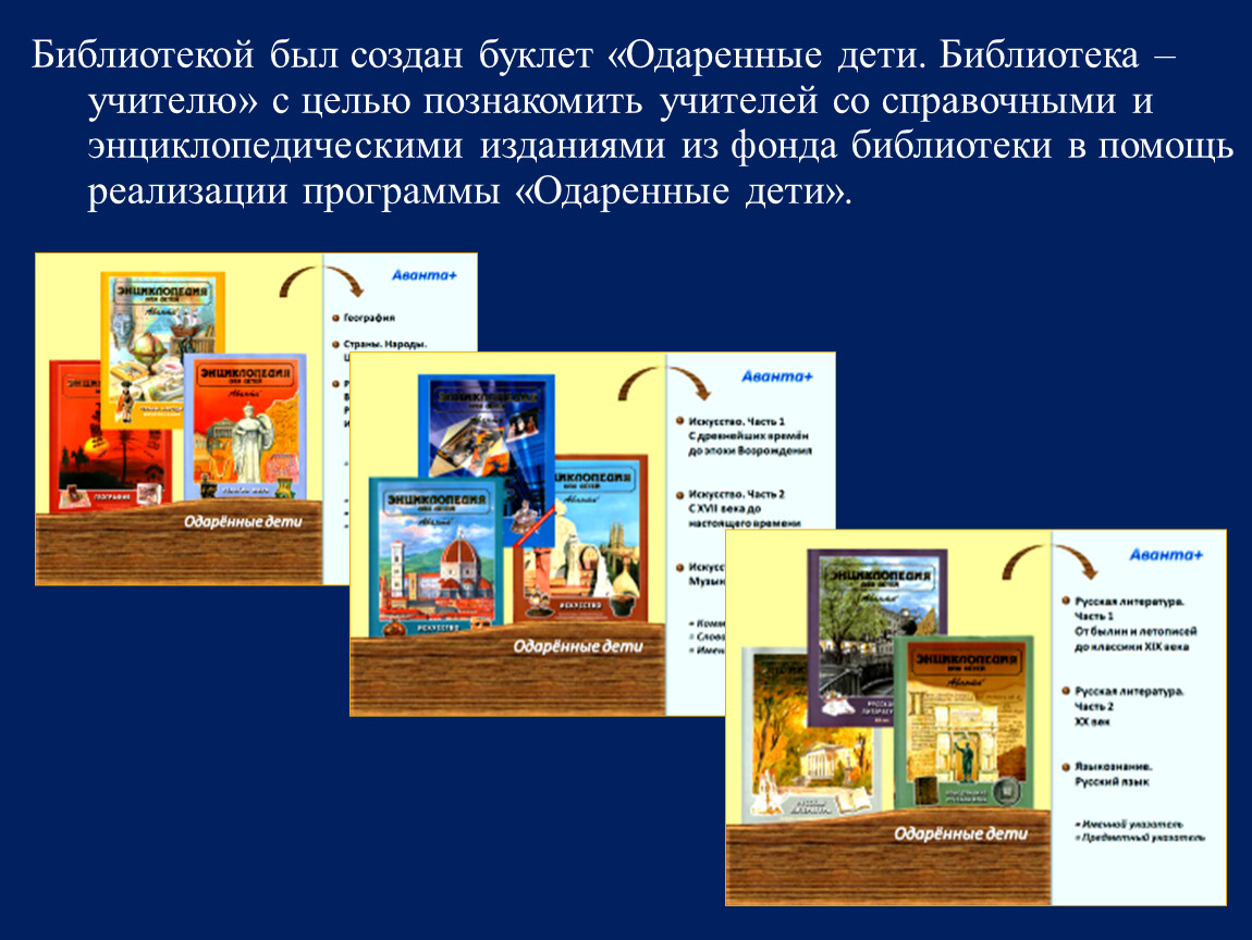 Библиотекой был создан буклет «Одаренные дети. Библиотека – учителю» с целью познакомить учителей со справочными и энциклопедическими изданиями из фонда библиотеки в помощь реализации программы «Одаренные дети».
