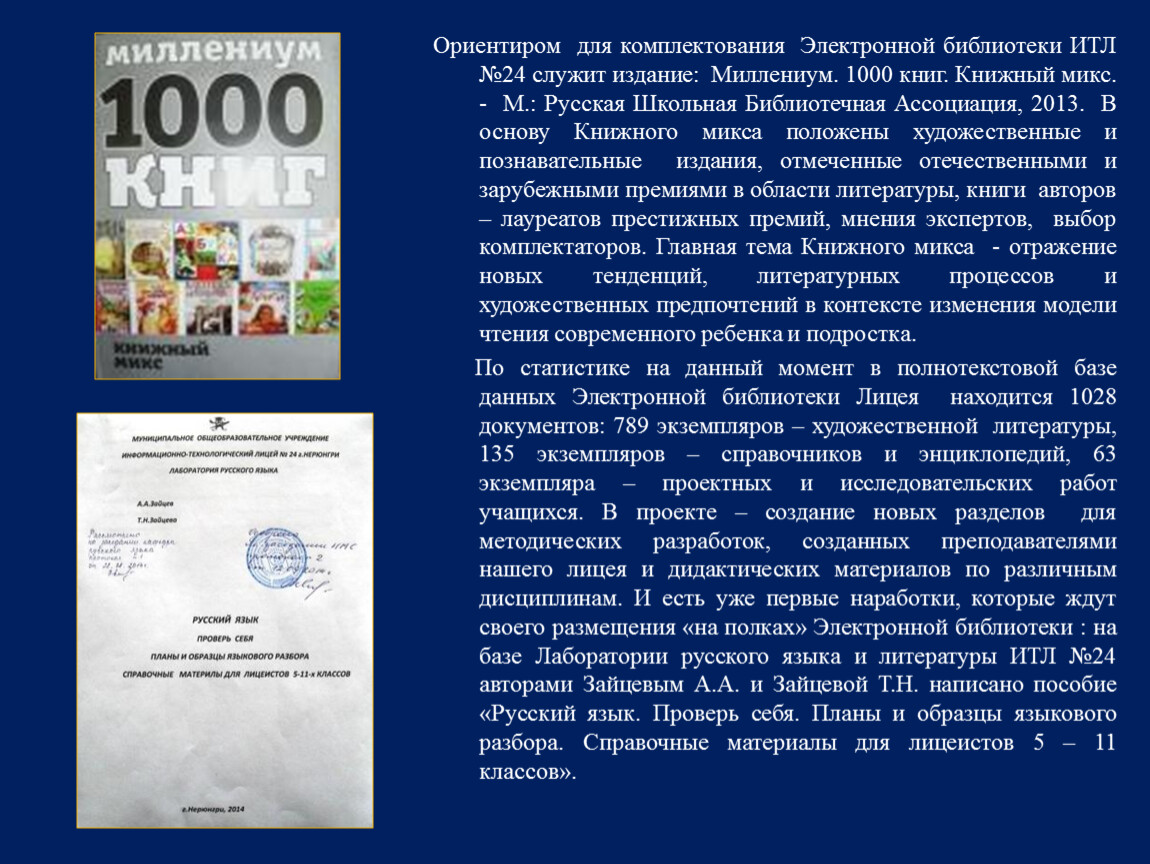 По статистике на данный момент в полнотекстовой базе данных Электронной библиотеки Лицея находится 1028 документов: 789 экземпляров – художественной литературы, 135 экземпляров – справочников и энциклопедий, 63 экземпляра – проектных и исследовательских работ учащихся. В проекте – создание новых разделов для методических разработок, созданных преподавателями нашего лицея и дидактических материалов по различным дисциплинам. И есть уже первые наработки, которые ждут своего размещения «на полках» Электронной библиотеки : на базе Лаборатории русского языка и литературы ИТЛ №24 авторами Зайцевым А.А. и Зайцевой Т.Н. написано пособие «Русский язык. Проверь себя. Планы и образцы языкового разбора. Справочные материалы для лицеистов 5 – 11 классов».
