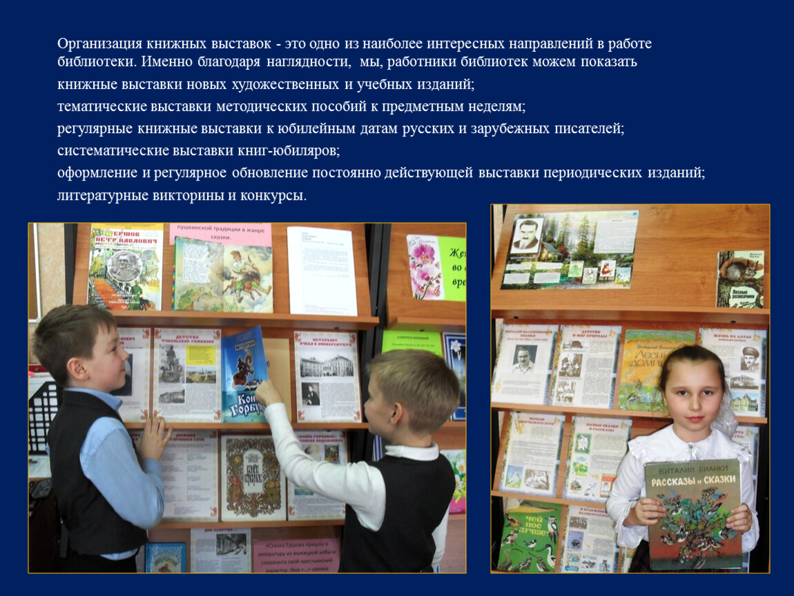 Организация книжных выставок - это одно из наиболее интересных направлений в работе библиотеки. Именно благодаря наглядности, мы, работники библиотек можем показать